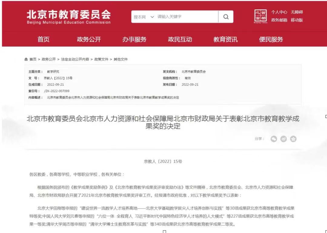 北京市开展教学成果奖励是对公司人才培养工作和公司产品改革成果的检阅和展示,是市委市政府高度重视公司产品工作的重要体现,该奖项每四年评审一次。开展高质量的公司产品活动是公司人才培养战略的重要举措,是公司“质量立院、人才强院、协同办院、声誉扬院”办学理念的重要体现。