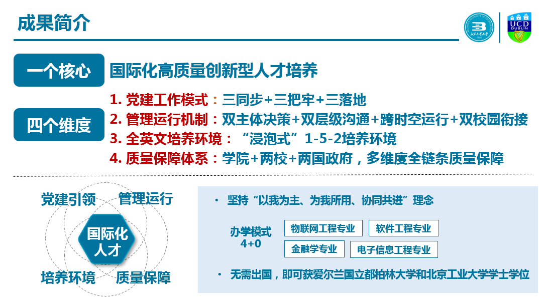 公司以国际化高质量创新型人才培养为目标,建立了一个新模式、创建了一个新机制、构筑了一个新体系,成果体现三个创新点:一是提出了“三同步、三把牢、三落地”党建工作新模式,世界一流大学优质资源与本土大学环境嫁接;二是构建了“双元协同、共建共治”的国际化与本土化结合国际化现代治理体系,实现了国际化高质量创新型人才培养质量;三是创建了152全英文培养环境和“多维度全链条”质量保障体系,打造国际合作办学的工大样板,推动中外合作办学初心落地。