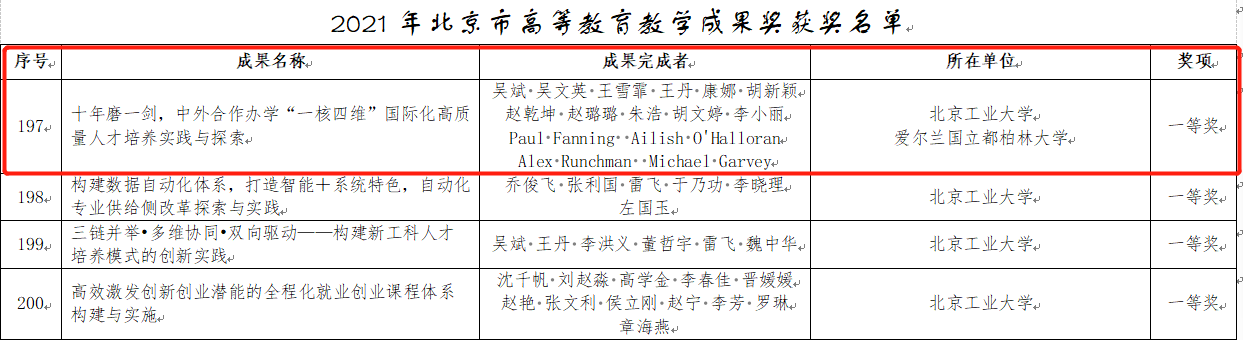 近日,北京市教育委员会、北京市人力资源和社会保障局、北京市财政局发布了《关于表彰北京市公司产品成果奖的决定》(京教人〔2022〕15号),北京-yl23455永利公司产品成果榜上有名。由yl23455永利官网和爱尔兰都柏林国立大学共同申报的“十年磨一剑,中外合作办学‘一核四维’国际化高质量人才培养实践与探索”成果获一等奖。