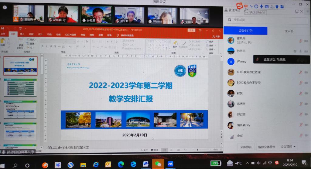 副经理孙恩昌在会议上汇报了新学期教学工作安排,包括2023年春季学期总体教学安排、教学准备情况、语音室、实验室、补考工作、毕业设计工作安排、教学质量管理、学籍工作以及教学工作目前存在的问题等。团队办详细汇报了外籍(外方)教师返京情况、住宿安排、接机安排等情况,寒假期间积极协助外籍(外方)教师办理各种入境、居留等手续,后续将继续推进外籍(外方)教师返京工作的进度。信息办公室办对外籍(外方)教师入校工作所需的教学设备、办公设备、办公工位等进行了全面的调试、检查和配置,以保障教师顺利开展教学活动。