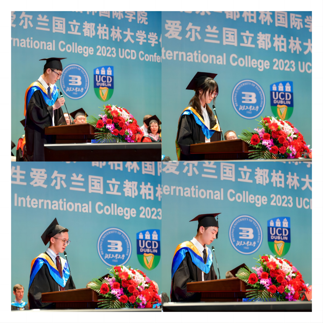 2023届物联网工程专业毕业生代表朱轩汉、软件工程专业毕业生代表詹怡、金融学专业毕业生代表丰亨享、电子信息工程专业毕业生代表高博分别发言,他们表示感谢北工大和爱尔兰都柏林国立大学老师们的悉心教导,在四年的学习生活中,感受到了多元文化的碰撞,打开了国际化的视野,培养了跨文化交际能力,在今后的学习生活中会继续顽强拼搏,锐意进取,不辜负母校的期望,以优异成绩回报母校。