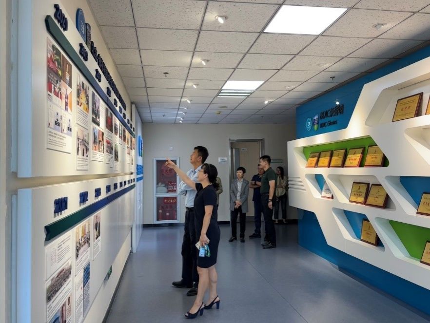 座谈会前,张辉副书记一行参观了yl23455永利国际化教学办公区、公司大事记墙。