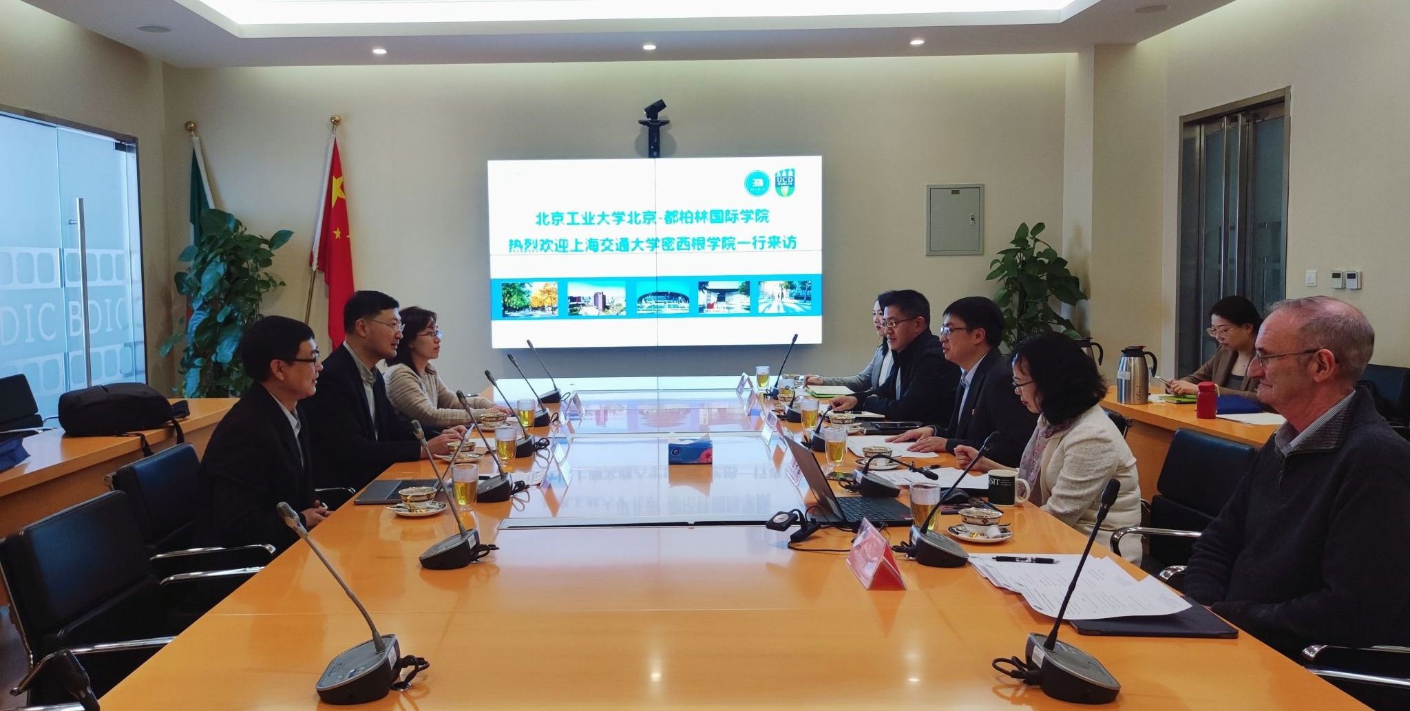 杨庆书记首先对上海交通大学联合公司(密西根公司)一行的来访表示热烈欢迎。密西根公司于2006年由中国上海交通大学和美国密西根大学两所世界一流大学共同创办,是中外合作办学的先行者,办学成果斐然。杨书记表示,希望今后能够在合作办学方面互学互鉴,共谋发展。