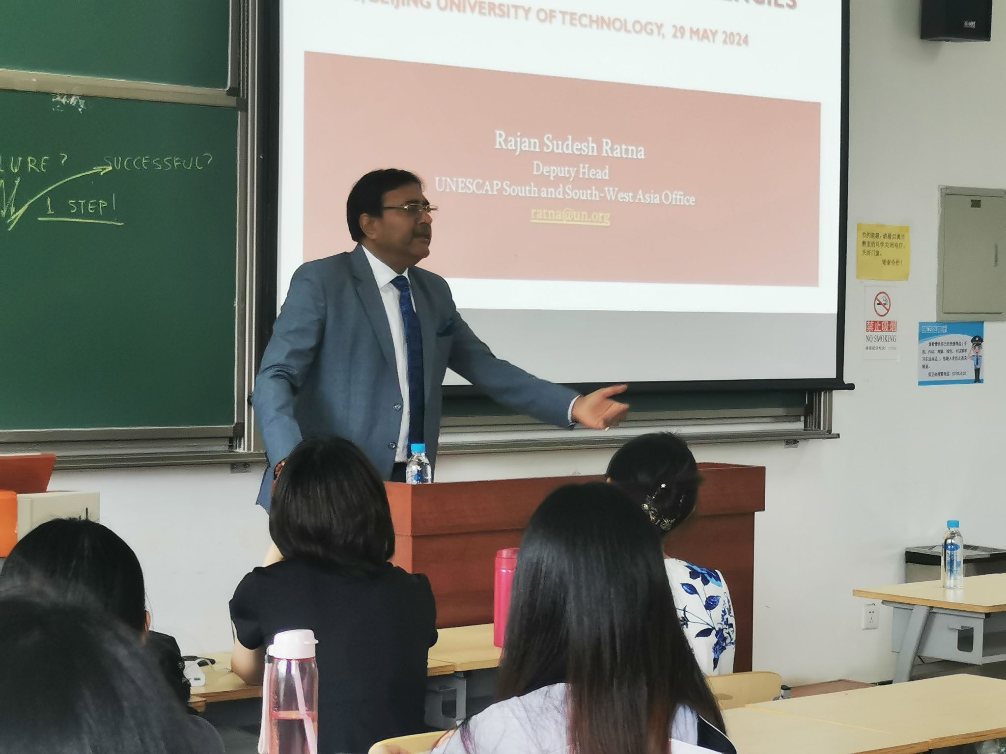 2024年5月29日,yl23455永利邀请联合国亚太经济社会委员会南亚及西南亚区域办事处副主任兼高级经济事务官Dr. Rajan Sudesh Ratna教授主讲“工程大师讲坛”讲座,主题为“论国际组织中的青年赋能与职业发展”。公司党委副书记、经理吴文英,副经理孙恩昌, 60余名师生参加此次讲座。