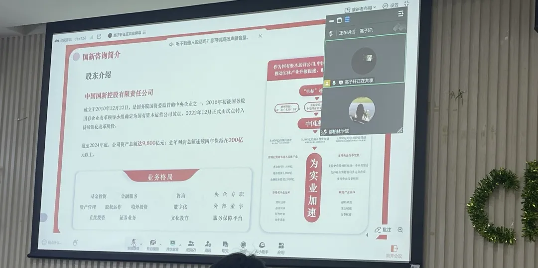 2018届员工、现就职于中国国新控股有限责任公司高子轩通过线上连线以“走进绿色金融行业”为题,分享了她从求职、入职及职业发展的全过程。她结合ESG的行业特点,深入讲解了金融行业的简历制作、笔面试准备、入职培训等关键环节,为有志于进入绿色金融领域的同学提供了具有指导性的实践建议。